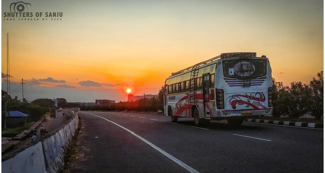 As the sun dipped low, a bus rolled by — a fleeting moment frozen through a mobile camera.