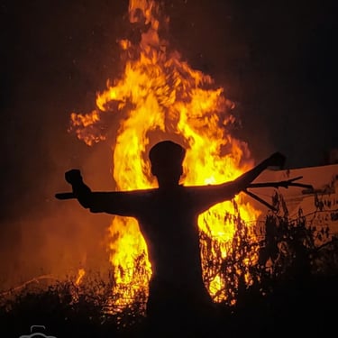 Silhouette captured against the backdrop of burning waste, set ablaze by an unidentified individual.